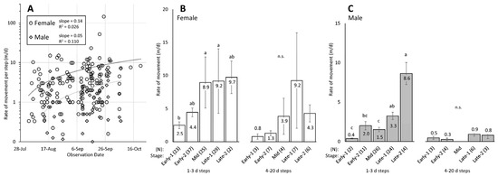 As with the maximum distance observed, the maximum rate of movement was accomplished by the same female, recovered on 27 September after moving 434 m from its previously known position three days prior, an average of 144.7 m/d. As with distance, a similar issue regarding outliers, changing frequency of movement, and differing amounts of time between observations (step duration) confound the calculation of the rate of movement. This is because if an insect was, for instance, only located after a period of 20 d, and had been sedentary for many days and then moved a long distance on one day, such behavior would not be captured by simply dividing distance by time. Therefore, the rate of movement per step was calculated using only the steps that were 1–3 d in duration, which included 183 of the 226 total steps that had movement. This revealed significant rates of movement differences between the five stages of adult females (ANOVA on log-transformed data; p = 0.006, df = 4, 111, F = 3.88) (Figure 5B), and males (p < 0.001, df = 4, 62, F = 9.18) (Figure 5C), similar to those of distance moved per step. The rate of movement using 1–3 d steps for females was significantly lower in Early-1 than in Mid and Late-1, which had similar rates of movement to each other. This is in contrast to males, which had a significant increase in rate of movement between Mid and Late. No differences over stages were found in the rates of movement of either sex with 4–20 d steps (females, p = 0.388, df = 4, 22, F = 1.08; males, p = 0.136, df = 3, 12, F = 2.24) (Figure 5B,C).