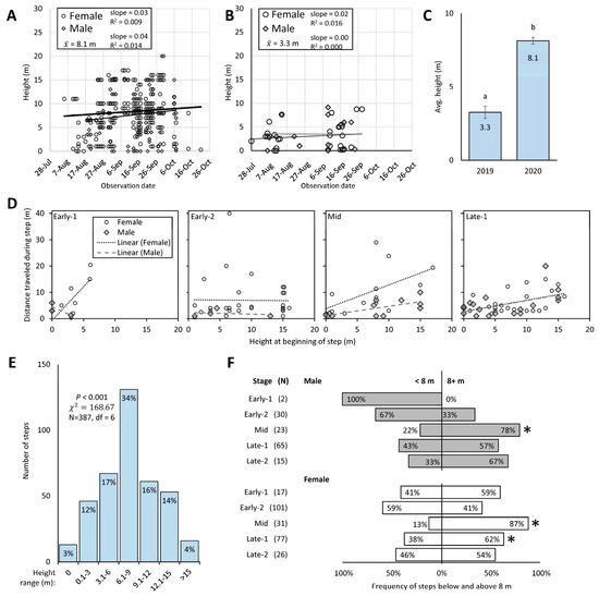 The height (m) above ground of male (gray diamonds) and female (open circles) (with linear lines for each) spotted lanternflies (SLF) L. delicatula tracked with radio telemetry (RT) is shown in scatter plots of raw step data by observation date in 2020 (A) and 2019 (B). Average SLF height in trees ± SE (m) at Trexler and Beaver Brook sites in 2019 and 2020, respectively (C) (Wilcoxon, p < 0.05, with different letters indicating significant difference). The number and frequency of SLF steps at different height ranges tracked with RT in 2020 for males and females combined over the entire season are shown in (D). The frequency of those steps that occurred above or below 8 m is shown in (E) for males (gray) and females (white) at each stage, with an asterisk indicating when the frequency was significantly greater in one height range than the other (Chi-square test, p < 0.05). Frequencies of male and female heights during each stage compared to the average height of 8 m are shown in (F).