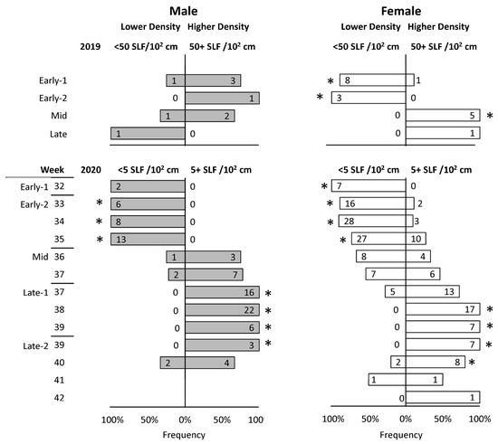 The observed density of SLF on surfaces where tagged SLF were located was recorded for 122 and 480 steps in 2019 and 2020, respectively. However, after excluding steps when SLF were found dead, or only the detached tag was found, or SLF remained on the tree on which they were released, only 27 and 276 steps in 2019 and 2020, respectively, were used for analysis. The density of the naturally occurring SLF population, as estimated at eye level, varied throughout the season and by year. The population density at the 2019 field site was much higher than at the 2020 field site. In the 2019 field season, roughly half of the steps of tracked SLF were located on surfaces where more than 50 SLF were naturally occurring in the most densely populated 10 × 10 cm2 area of the tree trunk at eye level, whereas in the 2020 field season, roughly half of all steps occurred on surfaces shared by a density of more than 5 SLF per 10 × 10 cm2 area. Using these cutoffs for 2019 and 2020, chi-square tests were conducted on each sex and time interval to determine if tracked SLF showed any density preferences over time. Because there were fewer data points in 2019, stages were used as time intervals, but in 2020, stages and weeks were used as time intervals (in some weeks, the first half of the week was in one stage and the second half was in another stage). It was revealed that both males and females were preferentially associated with lower densities during Early-1 and Early-2. However, a shift in density preference began in both sexes at Mid, with males completing the shift half a week earlier than females during Late-1 (Figure 9). In Late-2 males began to shift back, followed by females half a week later. During all of Late-1 and half of the first week of Late-2, males were found exclusively associated with the higher SLF densities on plants, and females followed the same pattern but delayed a few days.