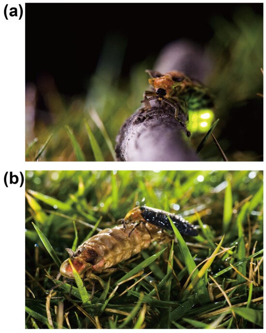 - Wang, Y.; Fu, X.; Lei, C.; Jeng, M.L.; Nobuyoshi, O. Biological characteristics of the terrestrial firefly Pyrocoelia pectoralis (Coleoptera: Lampyridae). Coleopt. Bull. 2007, 61, 85–93. [Google Scholar] [CrossRef]