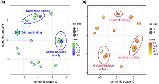 GO enrichment analysis of the expanded and species-specific orthologous family in P. pectoralis by Revigo. (a) GO terms of P. pectoralis-expanded genes are summarized and visualized as a scatter plot. (b) GO terms of P. pectoralis species-specific genes.