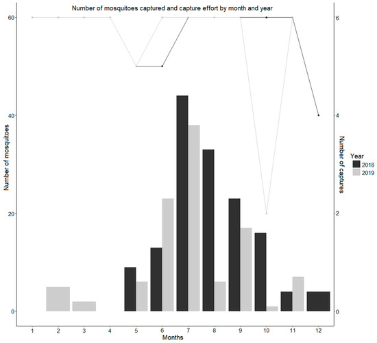 Seasonality of mosquito occurrence and capture effort by month and year. The number of mosquitoes is represented by the graph bar and can be measured on the y axis. The capture effort is measured by the number of captures, which is represented by the lines in the graph and can be read on the accessory vertical axis. The capture effort was six captures per month, except for October 2019, during which three captures were performed. The number of valid captures was also affected by trap malfunction.