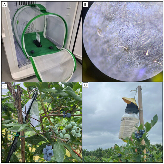 After 24 h, cages were removed from the chambers and refrigerated for 5–10 min to anesthetize flies, and the blueberries were removed from the cages. Each berry was inspected with a dissection scope and the total number of eggs, as identified by the protruding breathing tube filaments (Figure 1B), was recorded.