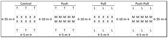 The experimental design was of randomized complete blocks with 5 replicated blocks of 4 treatments: push (MB dispensers present, SWD attractant lures absent), pull (MB dispensers absent, SWD attractant lures present), push–pull (MB dispensers present, SWD attractant lures present), and control (MB dispensers absent, SWD attractant lures absent). The arrangement of plots was randomized within each block.