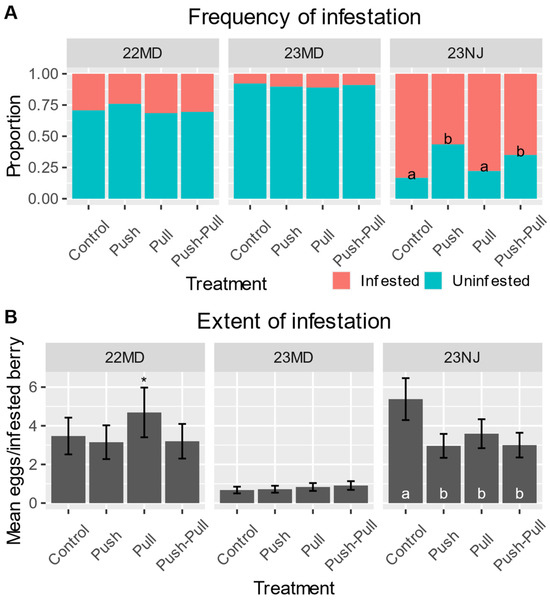 The 2023 field tests, one of which took place in MD and the other in NJ, experienced very different infestation rates. At the MD site in 2023, the overall frequency of infestation was less than half of what it was in 2022, at 14% compared to 32%, while the NJ site saw a 71% infestation (Supplementary Materials Figure S2A). The 2023 MD test did not show any significant differences between treatments in the frequency or extent of infestation, while the 2023 NJ test saw highly significant differences among treatments for both measures (Figure 3, Table 3, Supplementary Materials Figures S3 and S4). Our data produced an unexpected trend between the level of pest damage and the push–pull effects, with overall infestation rates of 14% indicating no significant effect, 32% revealing a marginally significant effect, and 71% exhibiting a highly significant effect (Figure 3, Table 3). Since only the one field test produced significant results for treatment differences, further testing in high-infestation scenarios is needed to better understand this trend, ideally with frequencies of infestation between 32 and 71%.