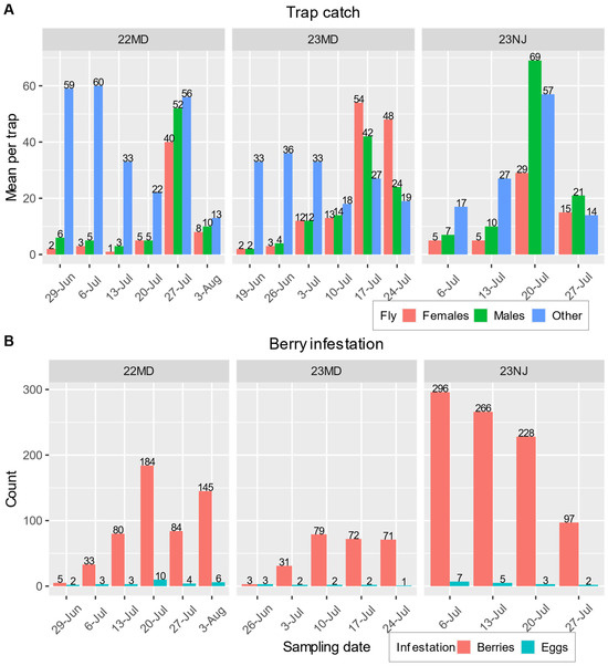 (A) Mean number of female SWD (orange), male SWD (green), and other fruit flies (blue) caught in lure-baited traps on the day of sampling for every week in each field test. (B) The total number of infested berries (orange) and the mean number of eggs in infested berries (blue) on the day of sampling for every week in each field test (no infestation was detected on 19 June 2023 in MD).