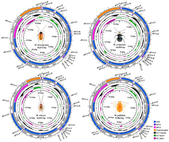 Raw reads (about 15 Gb) were obtained for each sample using high-throughput sequencing technology. A total of four newly sequenced complete mitogenomes of Monolepta were obtained in this study, which were M. bicavipennis Chen, 1942 [60]; M. cavipennis (Baly, 1878) [61]; M. pallidula (Baly, 1874) [62]; and M. wilcoxi Gressitt & Kimoto, 1965 [63]. All newly sequenced mitochondrial genomes were submitted to GenBank, with accession numbers OR582724-OR582727 (Table 1). The four newly obtained sequences were circled and ranged from 15,866 bp (M. pallidula) to 16,965 bp (M. wilcoxi) in length, with significant variation in the size of the species mainly occurring in the control regions. All newly sequenced mitogenomes contained 37 genes (13 PCGs, 22 tRNAs, and 2 rRNAs) and a large non-coding region (control region), which is usually present in most insect mitochondrial genomes (Figure 1). Overall, the mitogenomic structure and nucleotide composition of these four species exhibited typical features of the family Chrysomelidae. Among these 37 genes, 9 genes from 13 PCGs and 14 genes from tRNAs were transcribed on the majority strand (J-strand), with the remaining genes oriented on the minority strand (N-strand). The four new mitogenomes only had a few overlaps between their detected genes, and the organization was very compact (Table S2). A UUU anticodon in tRNA-Lys, unique to Chrysomeloidea, was derived in the four newly sequenced mitogenomes of Monolepta, which is consistent with previous research [30,35,37].