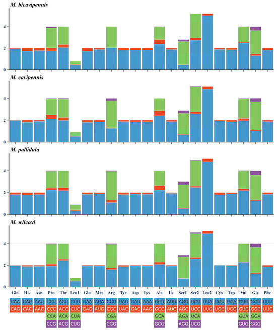 The AT content of the newly sequenced mitogenomes exhibited a high degree of similarity in nucleotide composition (Table 2). All new mitogenomes had a significant bias of the total nucleotide composition toward A and T: 79.1% in M. bicavipennis; 79.3% in M. cavipennis; 79.8% in M. wilcoxi; and 78.8% in M. pallidula (Table 2). The skew metrics of four mitogenomes showed that AT-skew was positive and GC-skew was negative in PCGs, rRNAs, tRNAs, and control regions. The skew analysis indicated that the obvious bias was toward the use of A and C in the whole genomes (Table 2).