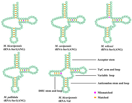 The secondary structure of tRNA-Ser1 (AGN) in the four newly determined mitogenomes, and the predicted secondary structure of tRNA-Val in the M. bicavipennis mitogenome. The pink circle represents a mismatched base, and the orange square represents a matched base.