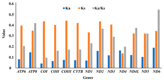 The average ratio of nonsynonymous (Ka) to synonymous (Ks) substitution could be used to estimate non-neutral changes relative to neutral changes and the degree of the selective pressure of a PCG [64]. In this study, the Ka/Ks substitution ratios of 13 PCGs were less than one, and ranged from 0.09672 (COI) to 0.54603 (ND6) (Figure 4). The results demonstrated that all PCGs were under purifying selection. The evolution rate of 13 PCGs was as follows: ND6 > ATP8 > ND4L > ND2 > ND5 > ND3 > ND1 > ATP6 > ND4 > CYTB > COIII > COII > COI. Among them, COI showed the lowest evolution rate, while ND6 and ATP8 exhibited a faster evolutionary rate and greater diversity than other PCGs.