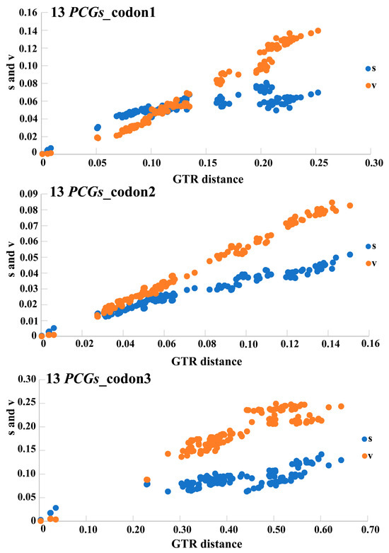 The chart of substitution saturation for the three different mitogenomes’ datasets. The plots show uncorrected pairwise divergences in transitions (s) (blue) to transversions (v) (orange) compared with divergences calculated by GTR model.