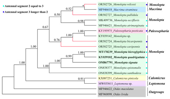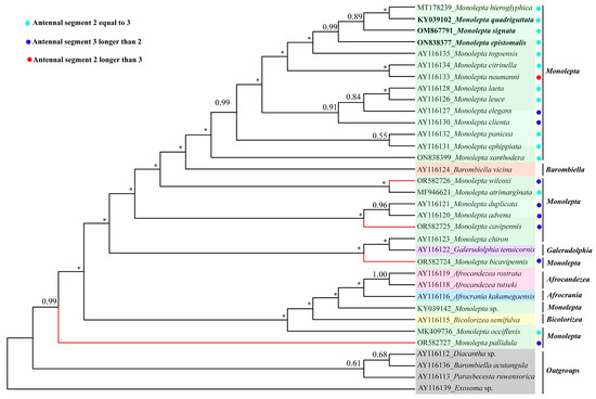The phylogenetic relationship of Monolepta at the species level has been explored by many researchers. Bolz and Wagner [29] first explored the phylogenetic relationship of “Monoleptites” including 16 species from Monolepta, using 20 external morphological characters and 14 male and female external genitalia features. The result showed that Monolepta was polyphyletic, with its four species standing out from most Monolepta species, that is, M. versicolora was closed to a clade of (Galerudolphia + Barombiella), and M. duplicata, M. didyma, and M. thomsoni were closed to Candezea centromaculata. Stapel et al. [8] explored the phylogenetic status of Afrotropical galerucines, including 14 species from Monolepta, based on morphological and molecular data (ND1 and ITS2), and the results supported that Monolepta was polyphyletic and, additionally, indicated that an elongated metatarsus has evolved multiple times in Galerucinae. Nie et al. [30] used mitochondrial genomes, including from five species of “Monoleptites” which showed Monolepta were paraphyletic, too.