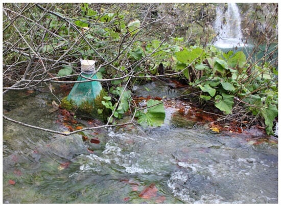 - Miliša, M.; Habdija, I.; Primc-Habdija, B.; Radanović, I.; Matoničkin Kepčija, R. The Role of Flow Velocity in the Vertical Distribution of Particulate Organic Matter on Moss-covered Travertine Barriers of the Plitvice Lakes (Croatia). Hydrobiologia 2006, 553, 231–243. [Google Scholar] [CrossRef]