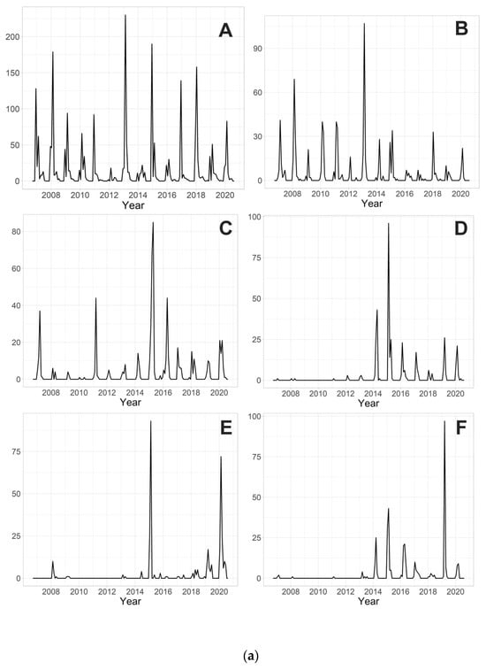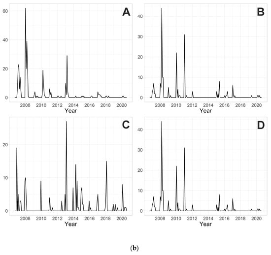 (a). Monthly abundances (the number of individuals caught in the traps from a surface area of approximately 0.4 m2, i.e., 45 × 45 cm; in a time period of one month) of (A) Parametriocnemus stylatus; (B) Tanytarsus brundini; (C) Tanytarsus arduennensis; (D) Rheopelopia eximia; (E) Rheotanytarsus curtistylus; and (F) Rheotanytarsus reissi during 14 years of research. (b). Monthly abundances (the number of individuals caught in the traps from a surface area of approximately 0.4 m2, i.e., 45 × 45 cm; in a time period of one month) of (A) Tanytarsus signatus; (B) Paratrichocladius skirwithensis; (C) Parametriocnemus sp. 2; (D) Polypedilum scalaenum during 14 years of research.