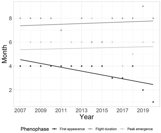 The earlier first appearance in the whole community was found in the later years of the study (MAD = 0.08; p < 0.05), as was the prolonged flight duration (Figure 3). The estimated duration of flight is 0.14 months longer each year (MAD = 0.12; p < 0.01). However, the peak of community emergence did not shift within the analyzed period (MAD = 0; p > 0.05) (Figure 3). Community flight duration was positively correlated (r (14) = 0.738; p < 0.01), while first appearance was negatively correlated (r (14) = −0.633; p < 0.05) with the COD. Community flight duration was positively correlated with higher values of mean water temperature in February (r (14) = 0.65; p < 0.05) and March (r (14) = 0.55; p < 0.05). Peak emergence was negatively correlated with higher water temperature values in May (r (14) = −0.58; p < 0.05).