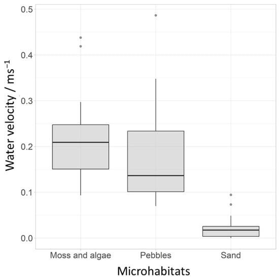 Average water velocity (m s−1) at different microhabitats (grey dots represent outliers).