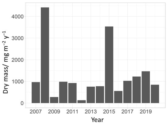 Annual mass of emerged chironomids (mg m−2y−1) from the six emergence traps at a tufa barrier over the analyzed period. All masses are measured as dry mass.