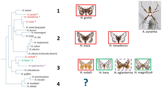 Hemileuca phylogeny, as presented by Rubinoff and Sperling [36] (Figure 6), including the proposed clades (1–4) and position of the Hemileuca taxa (pictured) evaluated for male attraction to caged Argiope aurantia. Boxes around each Hemileuca taxon signify whether there was no attraction (red box, and red taxon name with an *), strong attraction (green box with a green taxon name and an *), or a mixture of populations with no or strong attraction (purple hashed border with a purple taxon and an *) to caged A. aurantia (Supplementary Table S1). We did not evaluate Hemileuca attraction from any members of clade 4 and H. magnifica (‡) was originally considered a subspecies of H. hera, so we assume that its position would be in clade 2 with H. hera.