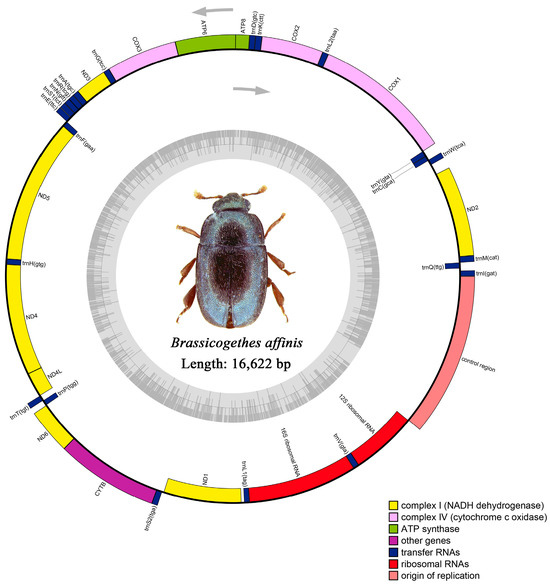 Circle map of the complete mitochondrial genome of Brassicogethes affinis.