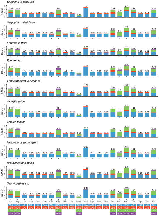 Relative synonymous codon usage (RSCU) of the PCGs of 10 species of Nitidulidae. The numbers above the bar graph indicate the frequency of amino acids.
