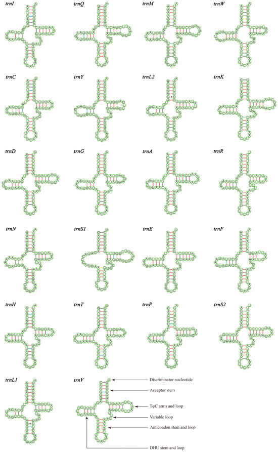 Predicted secondary structure for the tRNAs of Meligethinus tschungseni (A-U, G-C regular paired keys marked with red and black lines, respectively; G-U, C-U, A-C, A-G mismatched keys marked with blue, green, gray, and yellow lines, respectively; U-U mismatched keys marked with solid black dots).