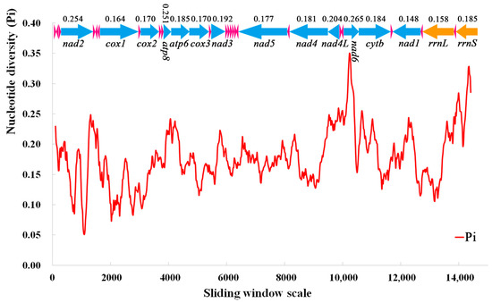 A sliding window analysis was used to study the nucleotide diversity of 13 PCGs, 22 tRNAs, and 2 rRNAs in the mitochondrial genomes of 10 species of Nitidulidae (Figure 7). The nucleotide diversity values ranged from 0.148 (nad1) to 0.265 (nad6). The nad6 (0.265), nad2 (0.254), and atp8 (0.251) genes had a higher nucleotide diversity, indicating that these genes had a high variability in Nitidulidae. On the contrary, nad1 (0.148) and cox1 (0.164) had a lower nucleotide diversity; therefore, nad1 and cox1 were conserved genes in Nitidulidae.