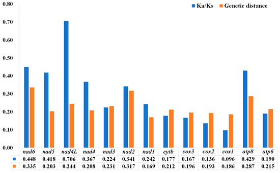 The results showed that the Ka/Ks values of the 13 PCGs were between 0.096–0.706, and the Ka/Ks values were all less than 1 (Figure 8), representing all the genes that evolved under purifying selection. Furthermore, cox1 (0.096) had the lowest Ka/Ks value, the lowest evolution rate, and exhibited the strongest purifying selection. In contrast, nad4L (0.706) and nad6 (0.448) showed higher Ka/Ks values than the other PCGs, and they exhibited relaxed purifying selection. The results of the pairwise genetic distances of the 13 PCGs of the 10 species of Nitidulidae are shown in Figure 8. cox1 (0.186) and nad1 (0.169) evolved relatively slowly, while nad6 (0.335) and nad2 (0.317) evolved relatively quickly.