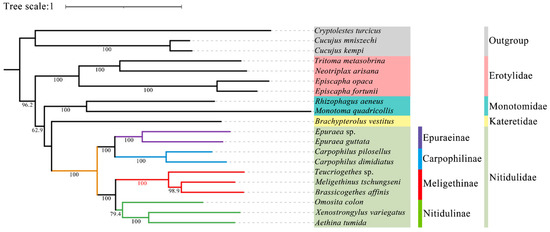 - Cline, A.R.; Smith, T.R.; Miller, K.; Moulton, M.; Whiting, M.; Audisio, P. Molecular phylogeny of Nitidulidae: Assessment of subfamilial and tribal classification and formalization of the family Cybocephalidae (Coleoptera: Cucujoidea). Syst. Entomol. 2014, 39, 758–772. [Google Scholar] [CrossRef]