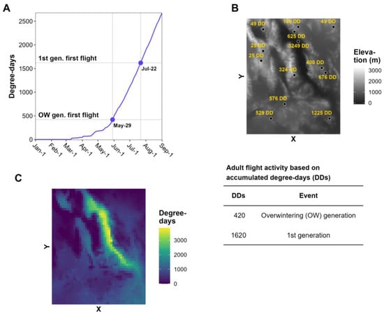 Degree-day (DD) accumulations for 1 January to 1 September predicted by site-based and spatial phenology models. (A) Plot of date vs. DD accumulations depicts dates of adult flight activity at a single site. (B) An elevation map with predictions for multiple sites is shown with a key of DD requirements for adult flight activity. (C) Phenological map of the same area as (B) shows continuous predictions. The X and Y axis in (B,C) indicate longitude and latitude, respectively.