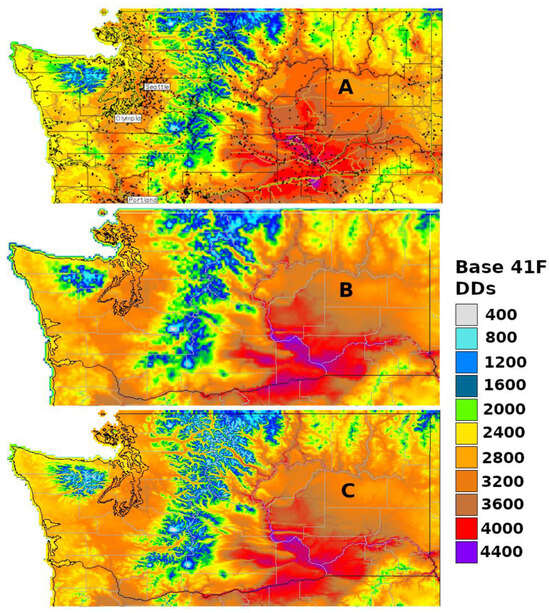 Example cumulative degree-day (DD) mapping products for Washington state generated online at USPest.org [https://uspest.org (accessed on 19 December 2023)]. All maps depict DD accumulation [base 41 °F (5 °C)] between 1 January and 31 August of 2020 (calculated using the single triangle method). (A) Map generated using an older version of the program [https://uspest.org/cgi-bin/usmapmaker.pl (accessed on 19 December 2023)] Awith a spatial resolution of 800 m. Black dots indicate the locations of weather stations used in the correction of monthly PRISM-based cumulative DDs. (B) Map produced by the newer program [https://uspest.org/dd/mapper (accessed on 19 December 2023)] that uses daily PRISM data with a coarser (4 km) spatial resolution (no weather station correction required). (C) Downscaled output produced using the newer program (800 m resolution).