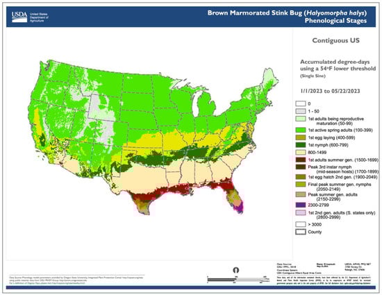 Degree-day lookup table map for the brown marmorated stink bug [Halyomorpha halys (Stål)] produced as part of the Spatial Analytic Framework for Advanced Risk Information Systems (SAFARIS) Field Operations Weekly map series []. The map uses a degree-day lookup table to associate cumulative degree-days with predicted life stages present across the contiguous United States on 22 May 2023. Thus, it provides a “snapshot in time” of phenology model predictions for a specific date. Reproduced with permission from SAFARIS, Brown Marmorated Stink Bug (Halymorpha halys) Phenological Stages. Published by SAFARIS, U.S. Department of Agriculture (USDA), and North Carolina State University, 2023. Available online: https://safaris.cipm.info (accessed on 19 December 2023).
