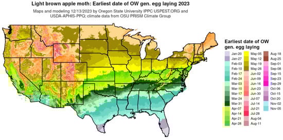 The prototype phenological event map developed for the codling moth in Oregon in the 1990s [] (Figure 4) led to the development of platforms that were partially or fully automated and capable of generating phenological event maps for multiple insect species, including pests and beneficials. For example, Grevstad and Coop [] developed partially automated phenological event maps that predicted the date at which Galerucella calmariensis (L.), a biological control beetle for purple loosestrife (Lythrum salicaria L.), would reach the photosensitive life stage across CONUS. Map predictions provided insight into whether the beetle would complete its life cycle and successfully overwinter at a given location, which may help guide decisions on where to release beetles.