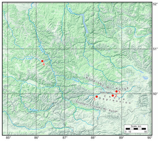 Collection sites of the studied species of darkling beetle. 1—Beltir Village, 2—Kosh-Agach Village, 3—Tabozhok Mt., and 4—Ongudai Village.