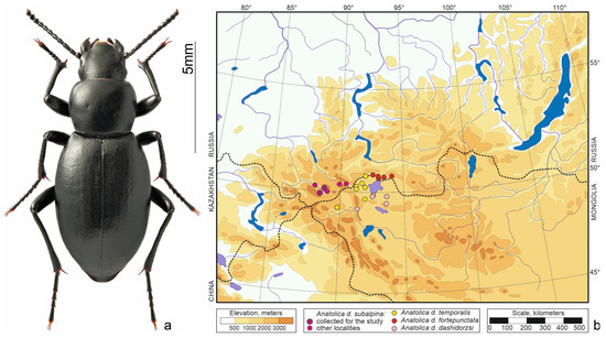 Anatolica dashidorzsi. (a) Habitus of the beetle from Kosh-Agach, photo by S.V. Reshetnikov; (b) distribution map according to [12,20] and collections of Siberian Zoologica Muzeum, Institute of Systematics and Ecology of Animals (SZMN).