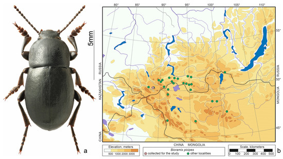 Bioramix picipes (Gebler, 1833) (Figure 5a)—distributed in the south of Siberia, Transbaikalia, Tuva, and Mongolia (Figure 5b). Inhabits mountain steppes and forest-steppes, where dryness and heat regularly alternate with moisture and coolness [22]. According to our observations, this is one of the least xerophilic species of darkling beetles in the South-Eastern Altai. At altitudes of 2200–2300 m, it is found as numerous in sparse larch forests; higher up (up to 2500 m) it prefers forb or shrub steppes.