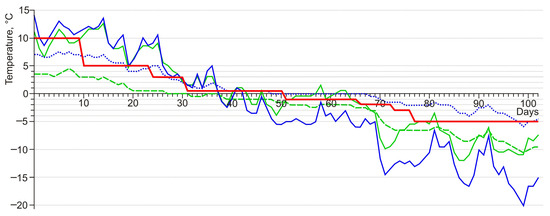 Darkling beetles were placed in groups of 10–40 individuals in plastic containers with holes for ventilation and a coconut fiber substrate. To select the regime of autumn acclimation of beetles in the experiment, we used previously obtained data on the seasonal variation of soil temperatures in darkling beetle habitats. Since temperature dynamics in microhabitats varied, this study used average values to smooth out sharp changes (Figure 6).