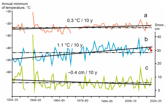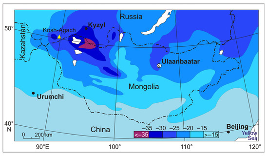 Analysis of the minimum soil temperatures at different depths in the range of the studied darkling beetle species is difficult due to the lack of published data for Mongolia, China and the few weather stations in Russia. A possible way to estimate the temporal and spatial variability of this parameter is to calculate it for a depth of 3 cm using the method of A.M. Shulgin [28]. It is based on weather station data on snow depth and minimum air temperatures. It is clear that temperatures at a depth of 3 cm are not of interest in connection with the wintering of darkling beetles, since the insects are not located this close to the surface. However, based on the diagram for temperatures at 3 cm and using data from the data loggers and weather stations using soil thermometers, one can get an idea of the stratification of temperatures in soils. Thanks to the availability of the initial data for calculations, it is possible to judge the temporal and spatial variability of wintering conditions for insects over a vast territory.