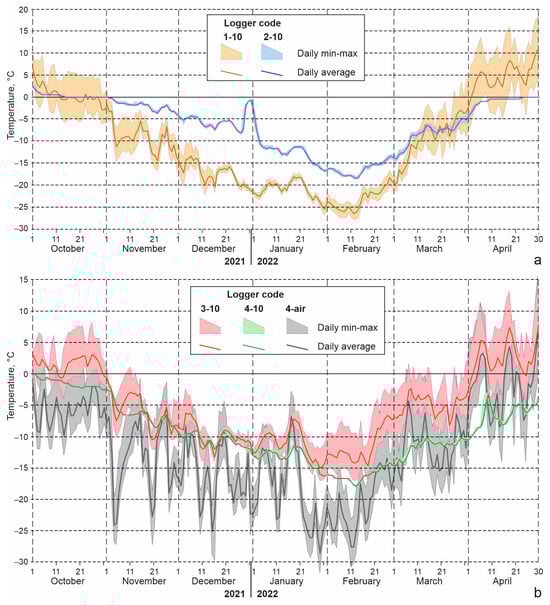 To assess the overwintering conditions of darkling beetles in natural habitats, soil temperatures at a depth of 1 and 10 cm and air temperatures at a height of 1.5 m were measured from autumn to spring at intervals of 4 h using TR-2V data loggers (Engineering Technologies LLC, Russia); measurement accuracy was ±0.6 °C in the range from −20 to −10 °C and ±0.5 °C from −10 to 65 °C. The loggers were installed on the bottom of the Chuya Depression, 5 km from the Kosh-Agach Village, as well as on the southern macroslope of the Kuraisky Mt. Range, near Mt. Tabozhok. Temperature measurements were carried out during the 2021–2022 and 2022–2023 seasons (Table 3).
