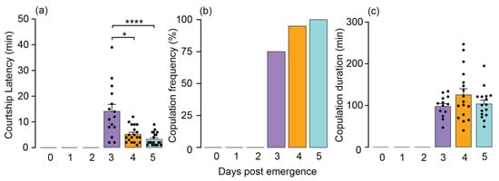 Courtship latency, copulation frequency, and copulation duration in Oxycarenus hyalinipennis males and females (n = 20). (a) Three-day-old adults displayed the longest latency to copulate (mean ± SEM: 14.20 ± 2.62), whereas the four- and five-day-old adults exhibited the shortest mean latency (mean ± SEM: 5.263 ± 0.73, and 3.30 ± 0.55, respectively). Copulation latencies are significant at **** p < 0.0001 and * p = 0.0262, according to Kruskal–Wallis and Dunn’s post hoc tests. Each dot within the bar indicates a replication. (b) Mating frequencies exhibited a significant surge starting from day 3 after emergence. Both male and female cotton seed bugs below the age of 2 days displayed reproductive inactivity. (c) Adults aged three, four, and five days old showed no effect on copulation duration (mean ± SEM: 98.31 ± 7.09, 126 ± 14.75, and 104.1 ± 8.94, respectively). Each dot within the bar indicates a replication.