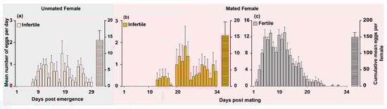 To better understand the egg-laying behavior of unmated and mated female O. hyalinipennis, we monitored individual females of both statuses throughout their first egg-laying cycle since emergence and first mating until females ceased egg-laying. Unmated females initiated egg-laying on day 7 and ceased on day 29 post emergence. Although we monitored unmated females until day 40, none of the females laid eggs after day 29. The cumulative mean number of eggs oviposited per female was 14.2 (Figure 2a). None of the eggs oviposited by unmated females were fertile. On the other hand, mated females started laying fertile eggs from day 2 and stopped on day 31 post mating. The cumulative mean number of fertile eggs oviposited during the first oviposition cycle (after mating for 24 h) was 151 eggs per female (Figure 2c). Interestingly, approximately 10% of eggs oviposited by the mated females were infertile (cumulative mean was 15.53 eggs per female) (Figure 2b) and mated females started laying infertile eggs from day 14 and stopped on day 34 post mating (Figure 2b).