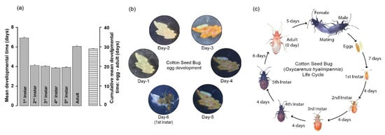 We monitored the developmental stages of cotton seed bugs, spanning from egg to adulthood, to determine developmental timelines under standardized laboratory conditions. Following mating, females commenced the process of oviposition, with an average duration of 5.3 days. Subsequent to egg deposition, the emergence of first instars occurred with an average developmental time of 6.92 days (Figure 3). The developmental durations for the second, third, fourth, and fifth instars were not significantly different, with averages of 4.12, 4.04, 3.86, and 3.92 days, respectively. The mean developmental period from the fifth instar to the emergence of adult cotton seed bugs was 6.1 days (Figure 3). Overall, the cumulative developmental timeline spanning from egg to adult encompassed 28.96 days (Figure 3). We also monitored unmated females to determine whether they laid eggs and tracked their developmental progress. Although 40–50% (n = 10) of unmated females did initiate egg-laying 3 to 4 days post emergence, none of the eggs hatched.