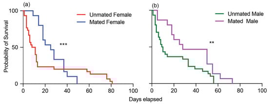 Effects of mating on the survival of male and female Oxycarenus hyalinipennis: (a) unmated female (red) and mated female (blue); (b) unmated male (green) and mated male (purple). Differences in the survival curves are significant (*** p < 0.0003, ** p < 0.003) according to the Gehan–Breslow–Wilcoxon test.