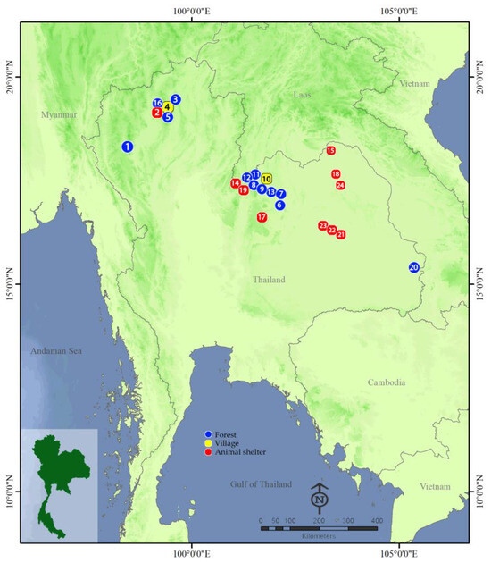 Map showing 24 sampling locations of wild adult black flies from Thailand used in this study. Details of sampling locations are included in Table 1.