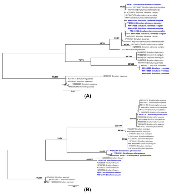 ML tree based on mitochondrial COI gene sequences of the adult specimens collected in this study (blue) and those reported in GenBank: (A) the S. batoense species group of the subgenus Gomphostilbia and (B) subgenus Asiosimulium. Bootstrap numbers based on 1000 replications for ML and NJ analyses are shown near the branches.