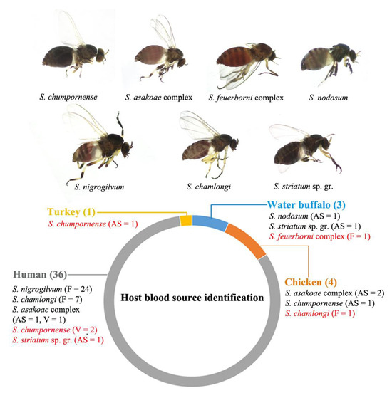More than half (29 of 54) of the blood-fed specimens collected in this study were from S. nigrogilvum, a human pest species [1,6]. This is because most of the specimens of this species were collected from a forest close to a village (Ban Pang Bong, Doi Saket District, Chiang Mai Province) where local people experience problems with this human-biting species. All host blood sources for S. nigrogilvum were identified as human. Another species with a considerable number (eight) of blood-fed females was S. chamlongi, which was also collected from the same location as S. nigrogilvum. This species was already known to be a human biter [22], and the results of the molecular identification of host blood meals support the previous finding, as seven of eight specimens were human blood. However, one specimen was identified as chicken blood, and this is a new host blood record for S. chamlongi. The host blood meal identifications for S. nodosum revealed that this species feeds on water buffalo blood, thus supporting previous findings [8]. Identifications of the host blood sources of the S. asakoae complex as human and chicken and those of S. chumpornense as chicken also support previous reports of the biting habits of these species [14]. However, we also found that S. chumpornense fed on humans based on the molecular identification of the host blood source. The host blood sources of the S. striatum sp. gr. specimens were molecularly identified as water buffalo and humans. The finding showing that members of the S. striatum sp. gr. were feeding on water buffalo agrees with a previous report stating that S. nakhonense, a member of the S. striatum sp. gr., is a buffalo biter [8]. However, another blood-fed specimen of the S. striatum sp. gr., collected around cattle pens from Loei Province, had fed on a human. This is another new host blood source record for this species. We also report, for the first time, the biting habits of the S. feuerborni complex, which feeds on water buffalo.