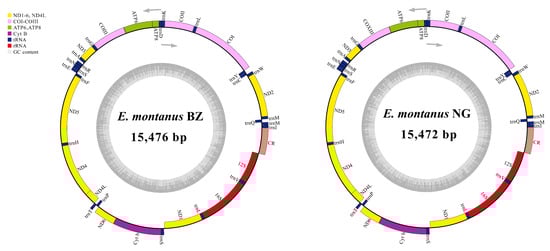 The circular mitochondrial maps of E. montanus BZ (left) and E. montanus NG (right). Genes located on the outermost circle are those found on the heavy strand, and those found on the inner circle are on the light strand.
