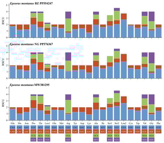 The RSCU of three mitogenomes of E. montanus.