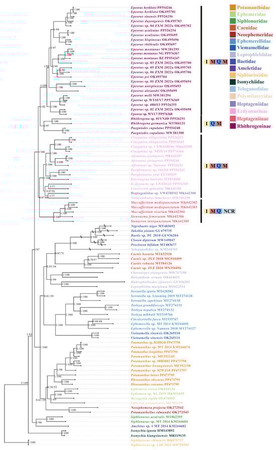 The results of phylogenetic analysis based on a tandem dataset of 13 PCGs of 95 mitogenomes (17 newly sequenced mitogenomes in this stfidy and 78 mitogenomes downloaded from NCBI). The posterior probability (left) and the bootstrap values (right) are shown on the nodes. Long branches in Baetidae and Teloganodidae were cut with double slash. The bars of I, Q, M, and NCR represent trnI, trnQ, trnM, and non-coding region, respectively.