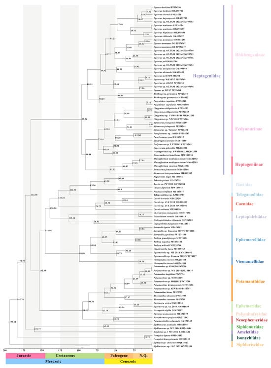There are few reported fossils among Ephemeroptera species. Five fossil calibration points selected from reports [86,87,88,89] and a fossil website (www.fossilworks.org, accessed on 15 April 2024) were used to estimate the divergence time of Heptageniidae on the basis of the phylogenetic trees. Kohli et al. [37] recently estimated the divergence time within Ephemeroptera, and their results showed that the Ephemeroptera began to diverge at 267.14 Mya, which was close to the Late Carboniferous or Early Permian, so we set this time as the root age. We selected the fossil of Siphlonuridae (159–160.6 Mya) as the first fossil calibration point [86]. The second fossil calibration point (15.00–20.00 Mya) was Borinquena schawallfussi of Atalophlebinae (Leptophlebiidae) [88]. The third (98.17–99.41 Mya) and fourth (41.30–47.80 Mya) fossil calibration points used belong to the recorded fossil of Vietnamellidae and Ephemerella (Ephemerellidae), respectively [87,89]. The final fossil calibration point (48.60–55.80 Mya) of Neophemera (Neoephemeridae) was chosen by the fossil website (https://paleobiodb.org, accessed on 15 April 2024).