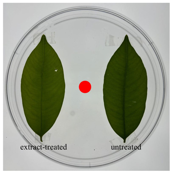 Methods provided by Qian et al. [9] were slightly modified to investigate the effect of hexane or acetone extracts of cuticle chemicals on the aggregation preference of second-instar H. vitessoides larvae. In brief, two A. sinensis leaves (collected from the same branch) were washed using distilled water and dried. One hundred microliters of extract (i.e., obtained from 5 mg of larvae/larva) was added onto the surface of one leaf and evenly smeared. The same amount of non-extracted solvent (hexane or acetone) was added to another leaf. These leaves were placed on the lab table for 10 min until the hexane or acetone completely evaporated. The extract-treated and untreated leaf was then pasted on the two sides of the bottom of a Petri dish (diameter: 15 cm; height: 2.5 cm) (Figure 1). Ten second-instar H. vitessoides larvae were randomly selected from the same cohort and placed onto the center of the bottom side of the Petri dish, and a lid was placed on it. In total, there were 120 experiment units, with ten replicates for each extract mentioned above. The cardinal direction of each Petri dish was randomly assigned. The bioassays were maintained at 26 ± 2 °C. At each hour until 8 h, the number of H. vitessoides larvae that stayed on the extract-treated or untreated leaf or on the surface of the Petri dish was counted.
